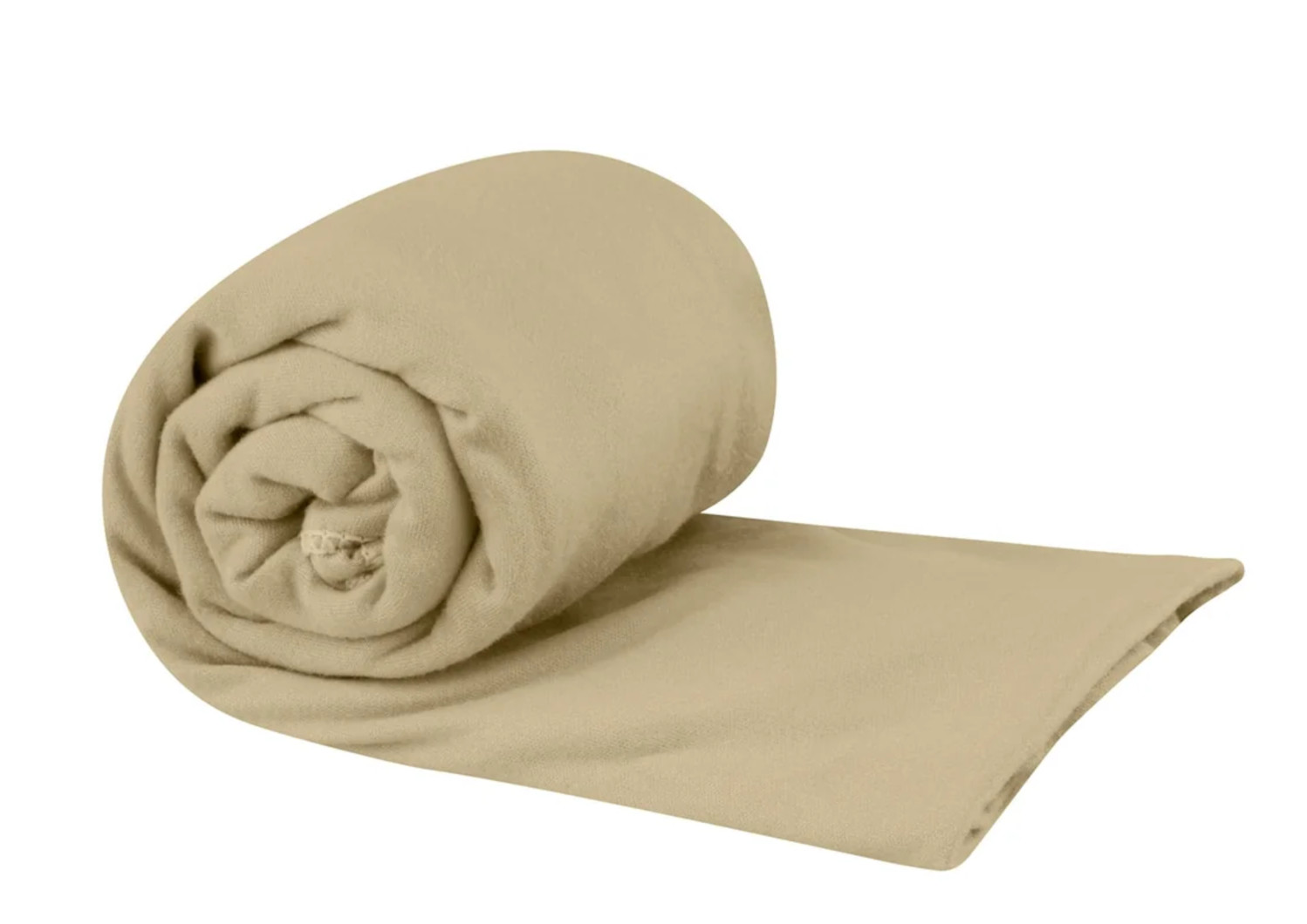 Ελαφριά και εύκολα συσκευάσιμη μπεζ πετσέτα. Απορροφά τρεις φορές το βάρος της σε νερό και στεγνώνει εξαιρετικά γρήγορα. Με απαλή και μεταξένια πλέξη.