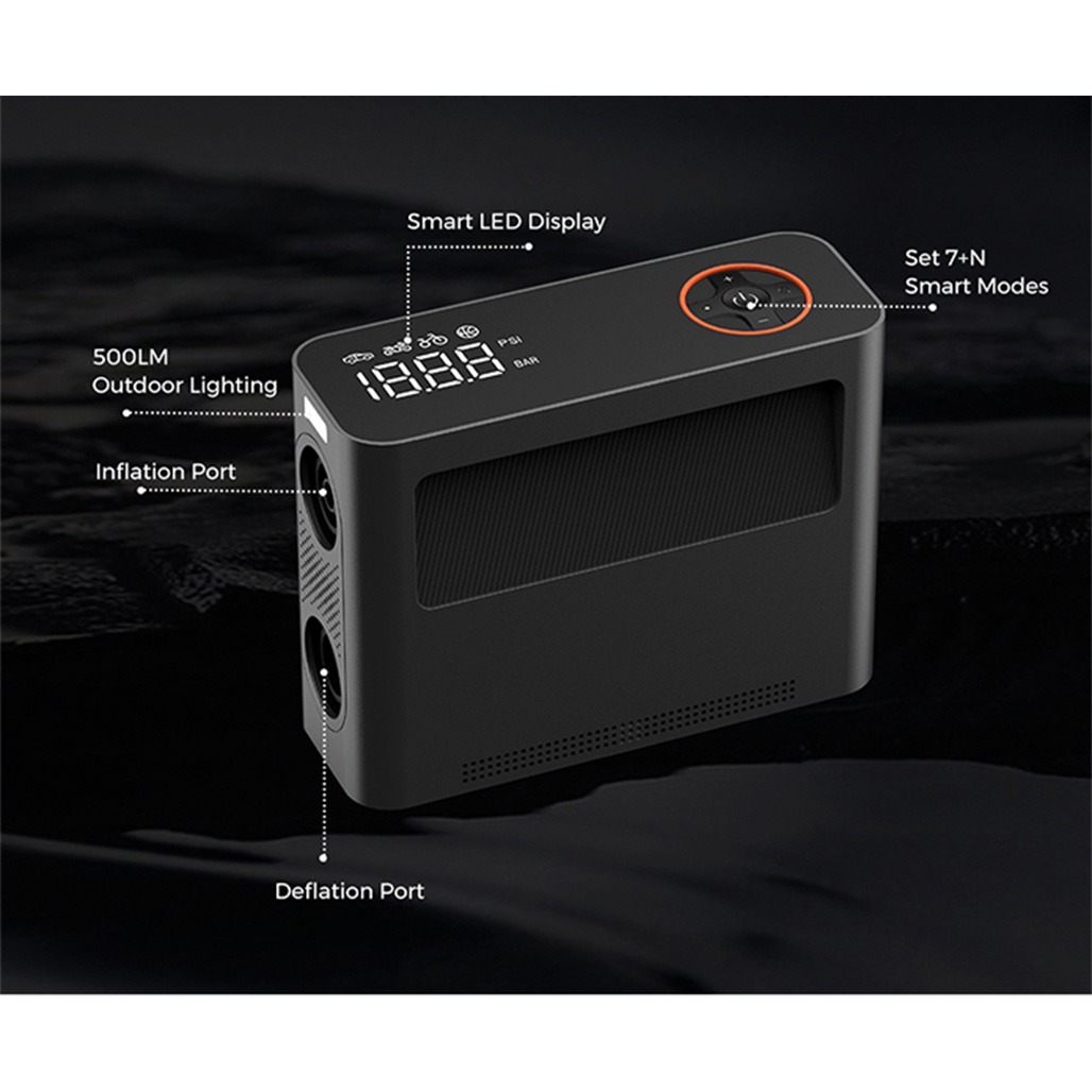 Με υψηλή πίεση έως 150 PSI, μεγάλη αυτονομία και πλούσιο εξοπλισμό, καλύπτει κάθε χρήση: από φούσκωμα ελαστικών μέχρι στρώματα camping, SUP, μπάλες, ακόμα και μικρές βάρκες.