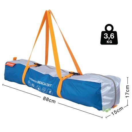 Η σκηνή έρχεται σε υψηλής ποιότητας τσάντα μεταφοράς με 2 ιμάντες ώμου – και ιμάντες σύσφιξης, και κλείσιμο με φερμουάρ για άνετη αποθήκευση και μεταφορά. Το μέγεθος της τσάντας μαζί με την σκηνή είναι περίπου 88x16x14 εκατοστά με το βάρος περίπου 3,6 κιλά