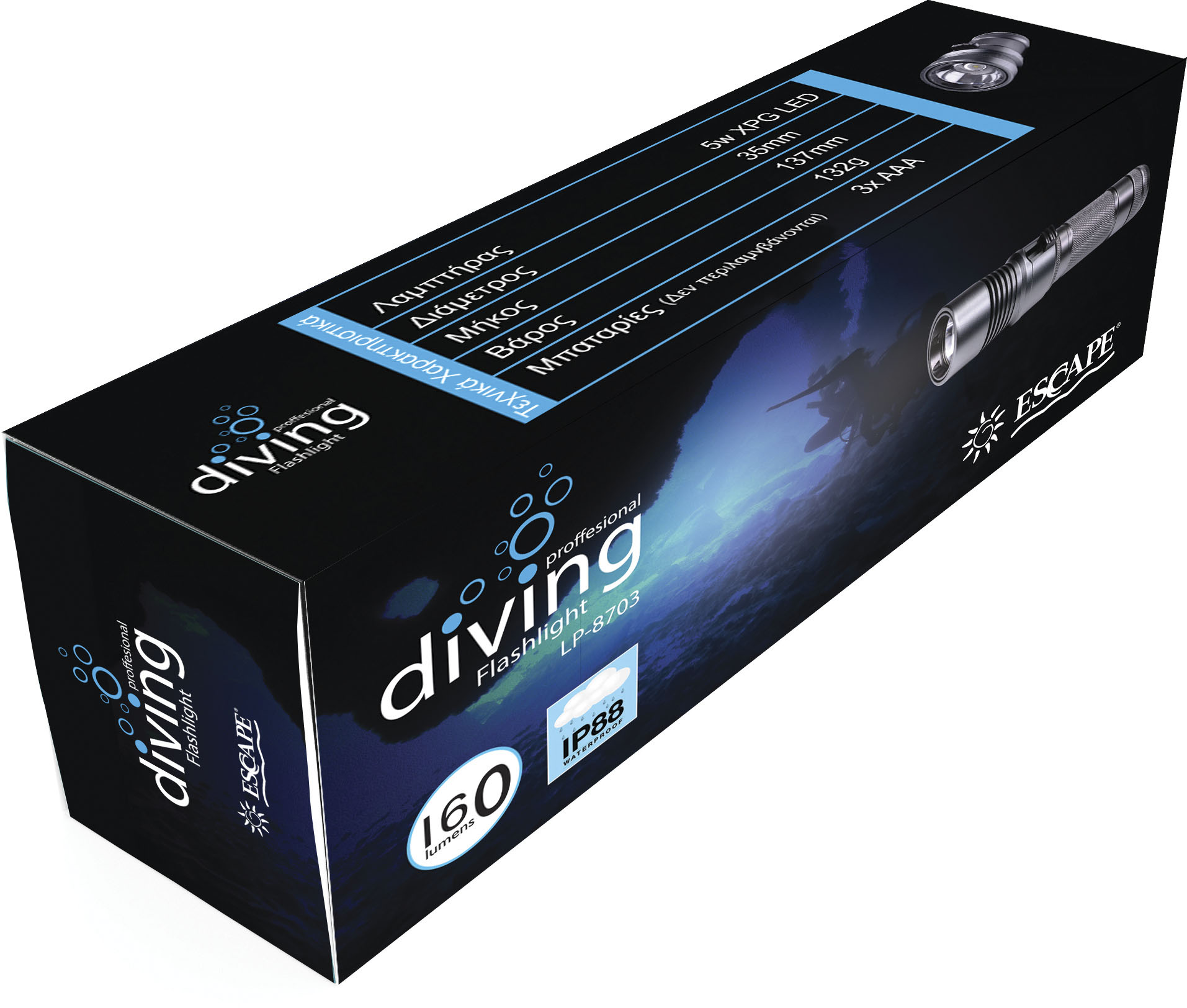 Φακός καταδυτικός από την Escape με πιστοποίηση IP88. Εξοπλισμένο με XPG LED που αποδίδει 160lm. Κατασκευασμένο από αλουμίνιο υψηλής ποιότητας. Διαθέτει κορδόνι για να μπορείτε να το περνάτε πάνω σας.