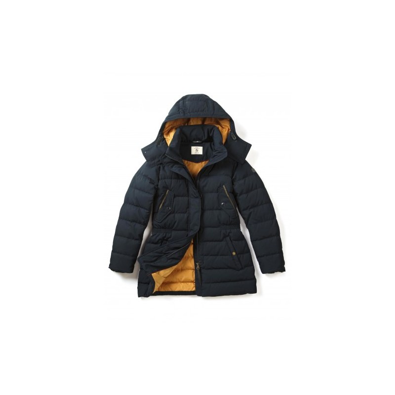 Πολύ ζεστό σκούρο μπλε υδρόφοβο πουπουλένιο μπουφάν. Ρυθμιζόμενη κουκούλα και ελαστική μέση για καλύτερη εφαρμογή.