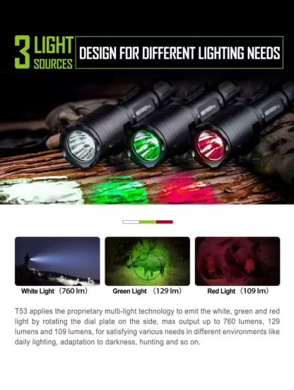 Ο Nextorch T53 έχει σχεδιαστεί ειδικά για κυνηγούς και χρήστες υπαίθρου που χρειάζονται ευελιξία φωτισμού χωρίς αλλαγή φίλτρων ή φακών.