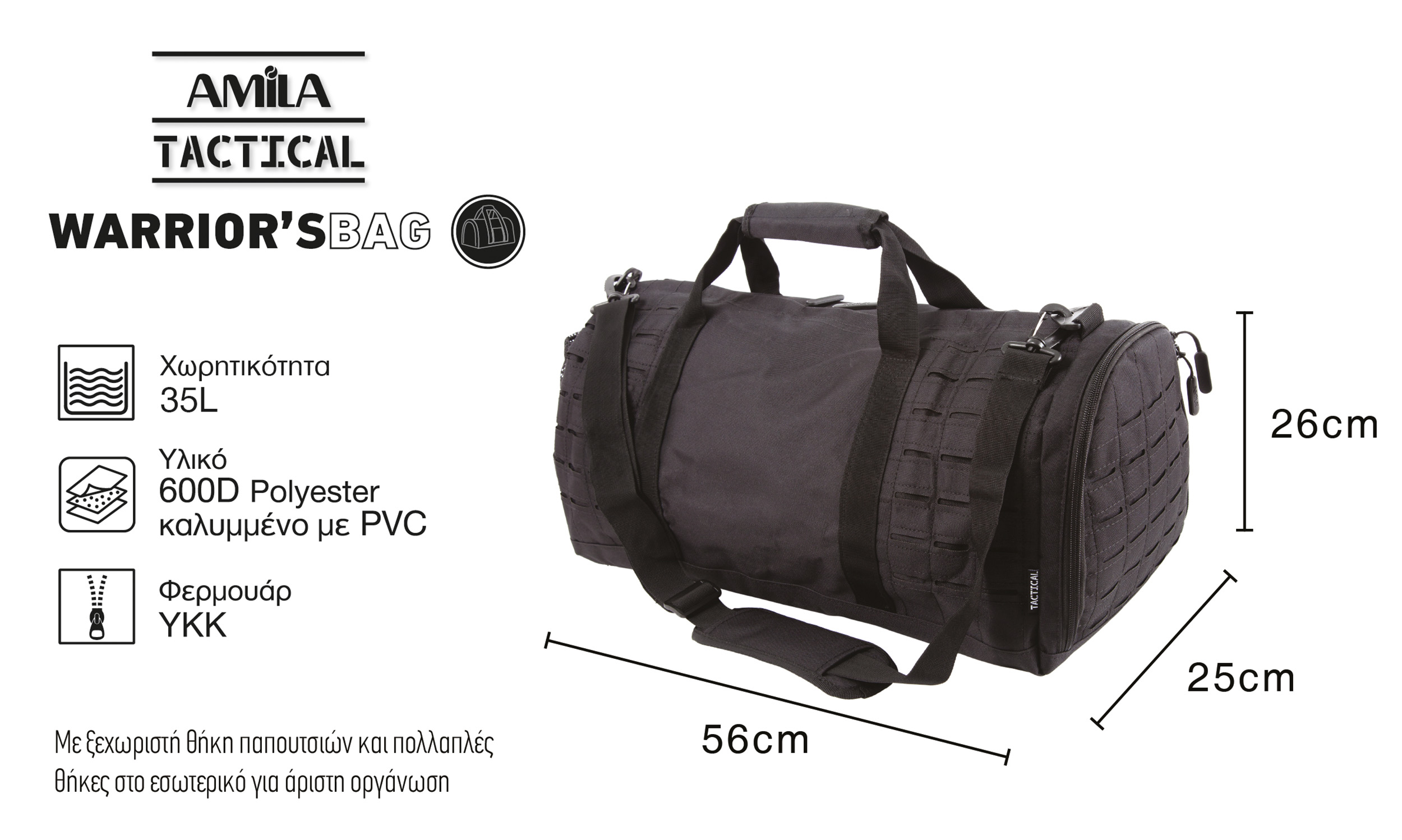 Το σακίδιο από την AMILA Warrior's Bag τύπου Duffel, είναι για αυτούς που στην προπόνηση τους δεν αφήνουν τίποτα στην τύχη και θέλουν να είναι πάντα στο top level. Διαθέτει ξεχωριστή θήκη παπουτσιών, σύστημα Molle περιμετρικά, με κομμάτι velcro για να βάλετε τα patches που σας αντιπροσωπεύουν κάνοντας την τσάντα προσωπική. Κρατήστε την τσάντα με 3 διαφορετικούς τρόπους, μεταφέροντας την εύκολα στο γυμναστήριο, και αποθηκεύοντας την στα ντουλαπάκια. Διαθέτει πολλαπλές θήκες για να μπορείτε να αποθηκεύσετε διάφορα πράγματα κρατώντας την οργάνωση σε υψηλό επίπεδο. Κατασκευασμένη με υλικά ιδιαίτερης αντοχής!